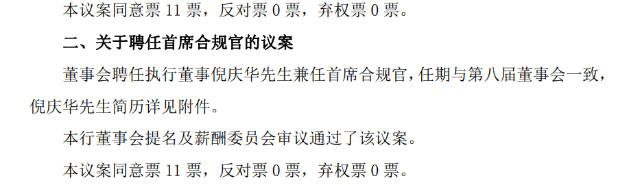 12月11日,江阴银行第八届董事会2025年第二次临时会议决议公告显示,董事会审议通过决定聘任执行董事倪庆华先生兼任首席合规官。