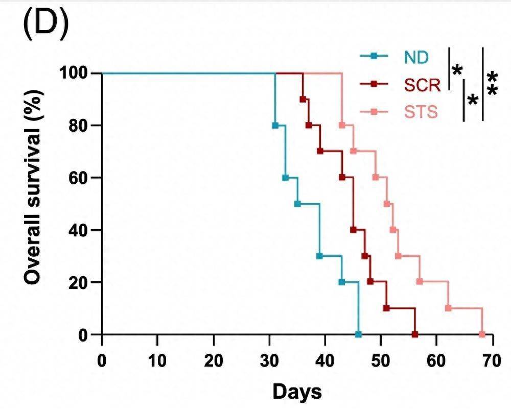正常饮食(ND)组、严格的热量限制(SCR)组和短期完全禁食(STS)组小鼠的生存曲线,可以看到短期完全禁食组的小鼠存活时间明显更长(参考资料[1])